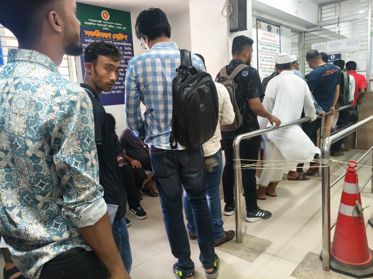 ছবিতে দেখা যায়, অনেকে ঘন্টার পর ঘন্টা লাইনে দাঁড়িয়ে আছেন, কেউ কেউ ক্লান্ত হয়ে নিচে বসে পড়েছেন। পাসপোর্ট অফিসের ভিতরে কিছু মৌলিক সুবিধার অভাব যে এখনো রয়ে গেছে, তা চোখে পড়ার মতো।